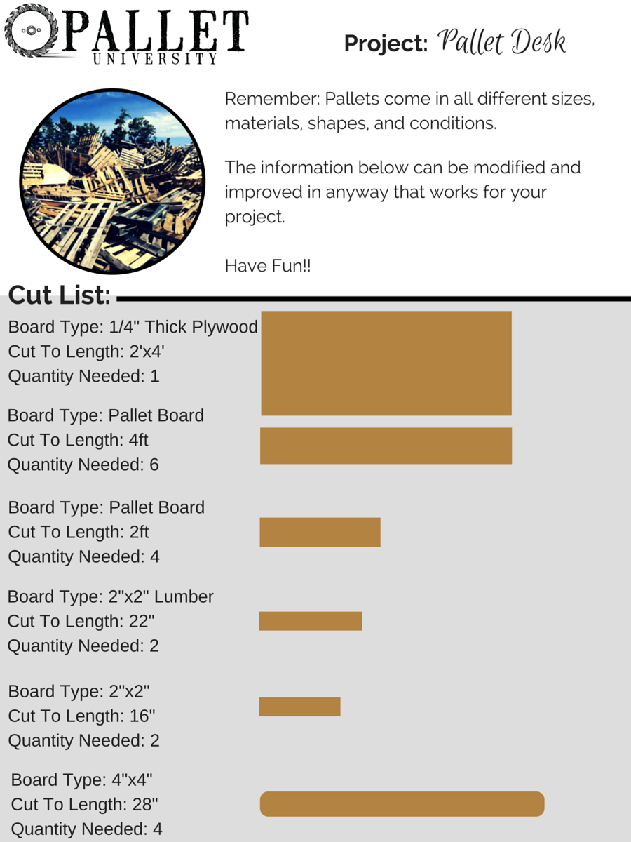 I decided to use a 2'x4' sheet of 1/4" plywood as a template for my desk top. Naturally, I just cut my pallet boards to be the same length. You may have to trim some of your plywood (lengthwise) because your pallet boards will likely not fit (widthwise) to the exact measurement of your plywood. I trimmed my plywood to fit 4 pallet boards side by side.